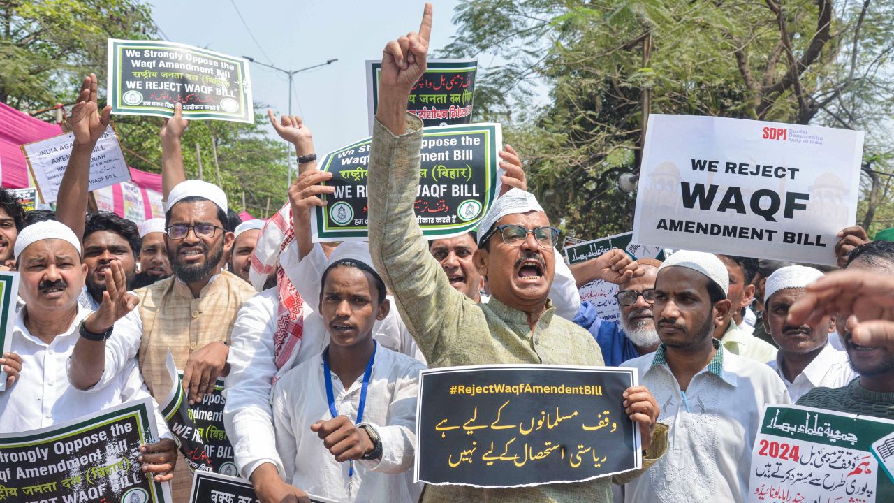 Protesters hold placards as they raise slogans against the Waqf Bill in Patna’s