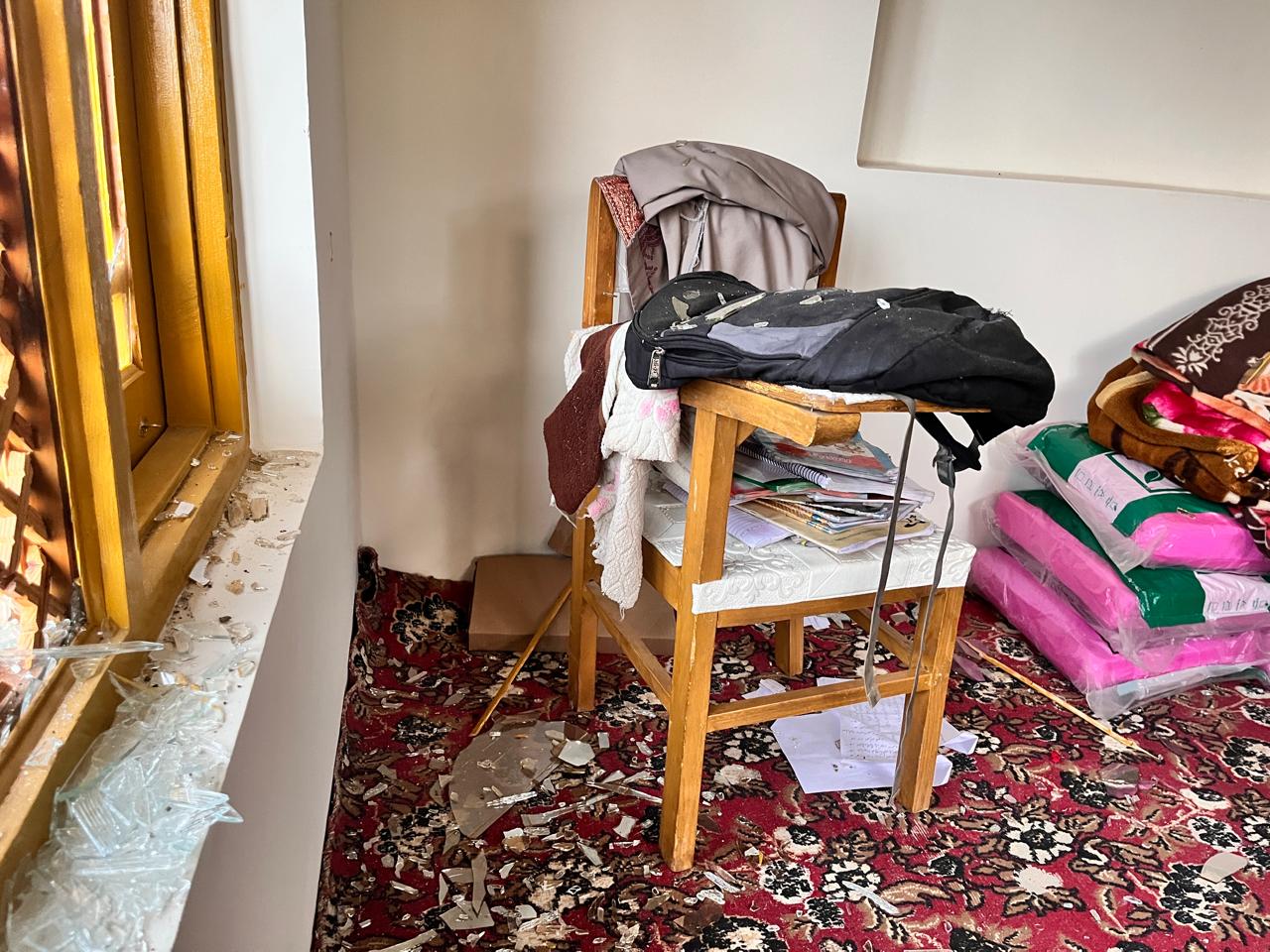 A school bag and notebooks lie abandoned on a chair inside a home damaged by cross-border shelling in Chowkibal village of Kupwara district.[/caption]